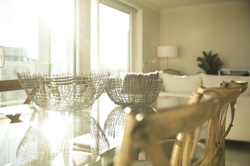 Light filled open living space with cool tiled flooring