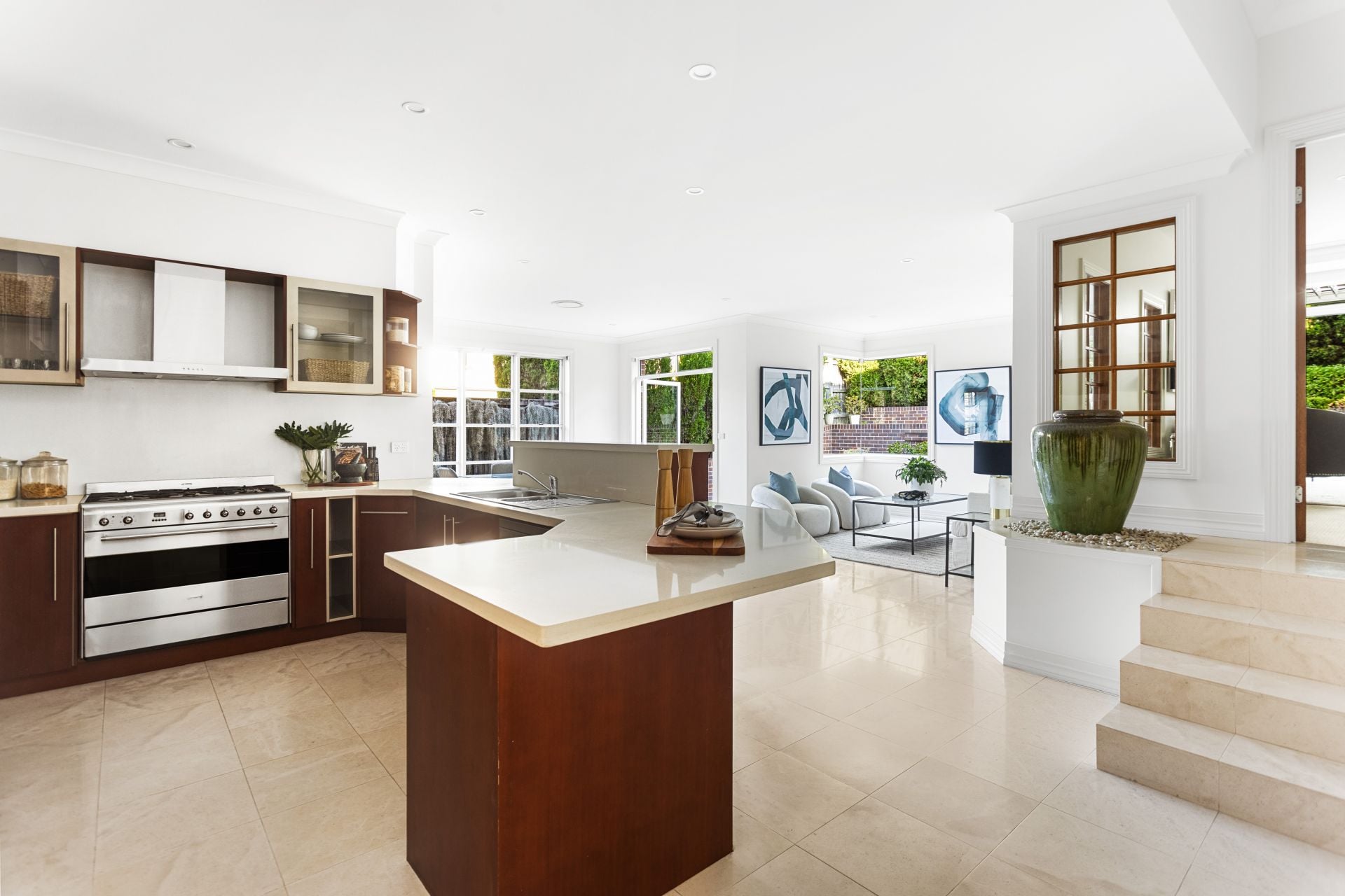 • Open kitchen with stone peninsula benchtop, Smeg oven, Miele dishwasher, and walk-in pantry