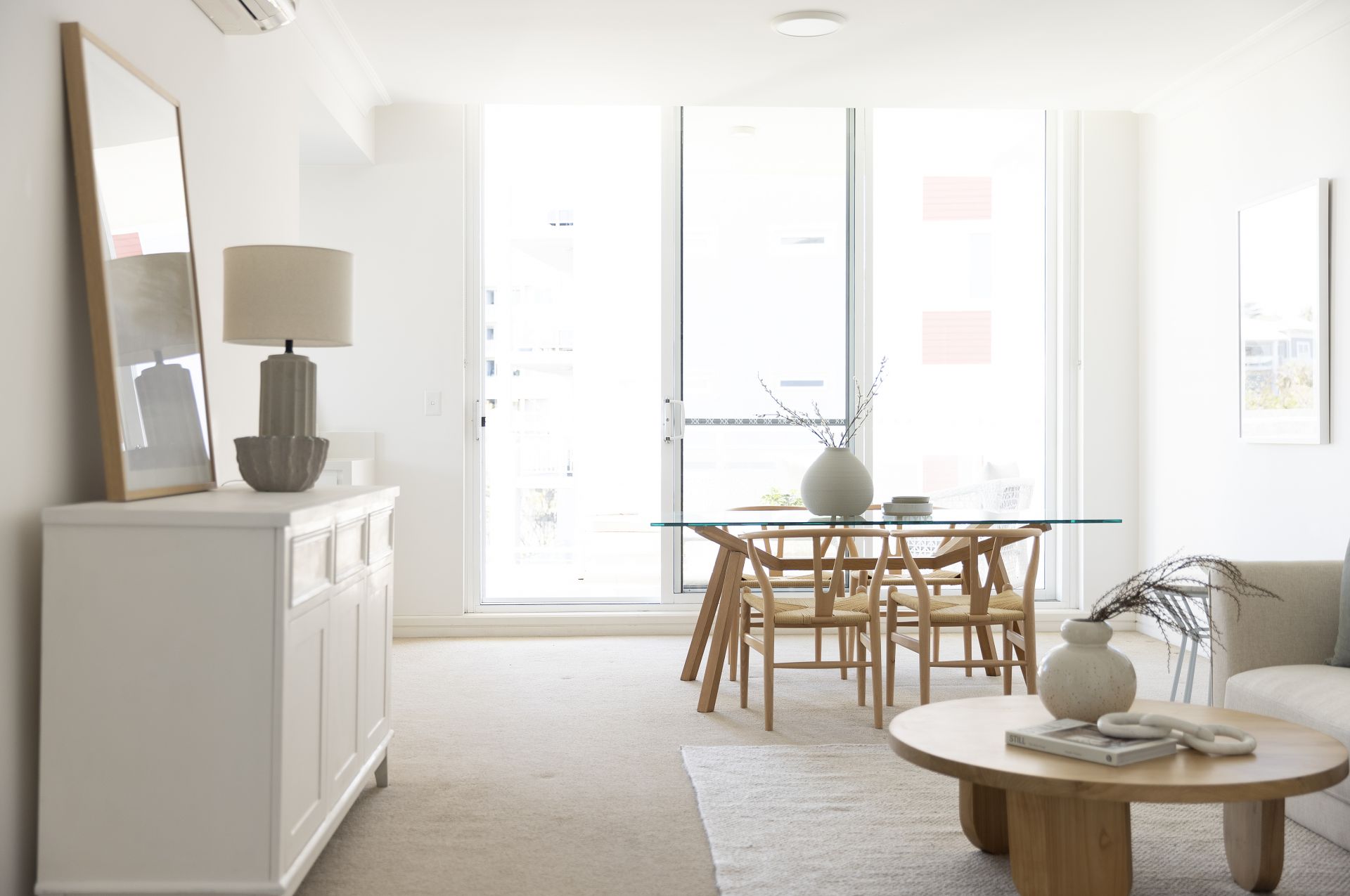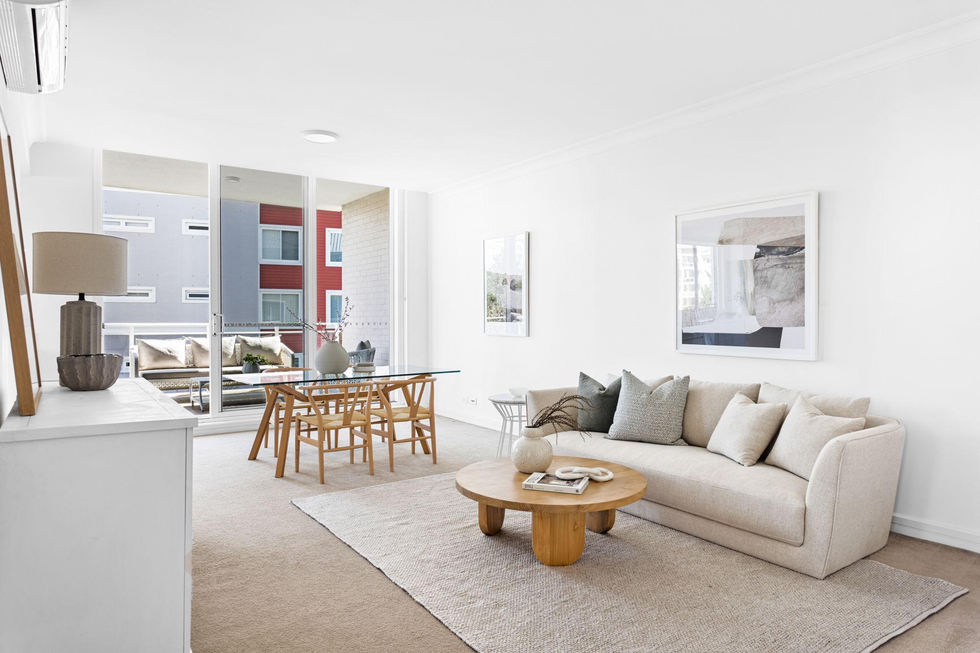 Spacious living/dining area bathed in light & media area