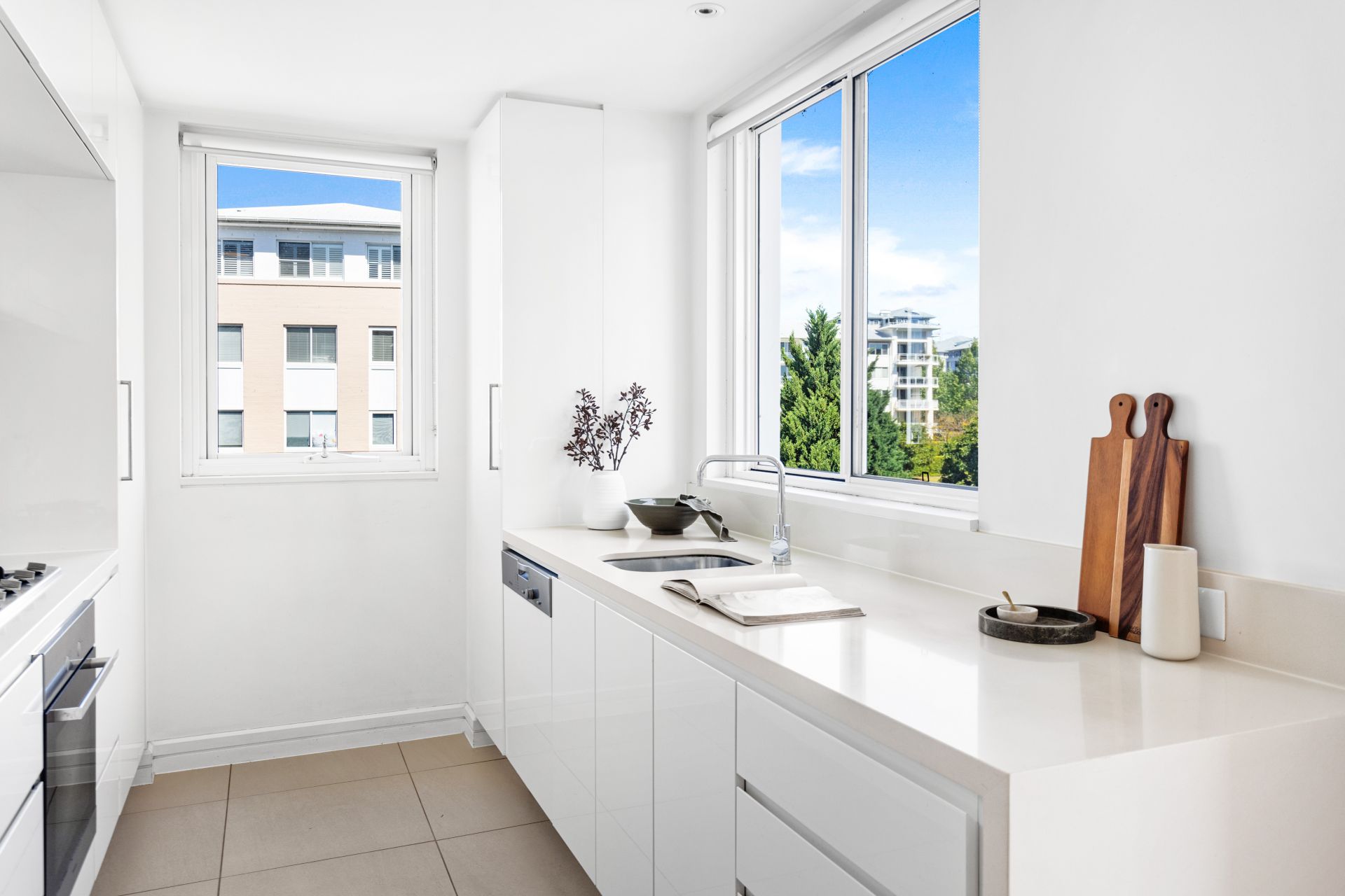 Window cased CaesarStone kitchen has Miele appliances