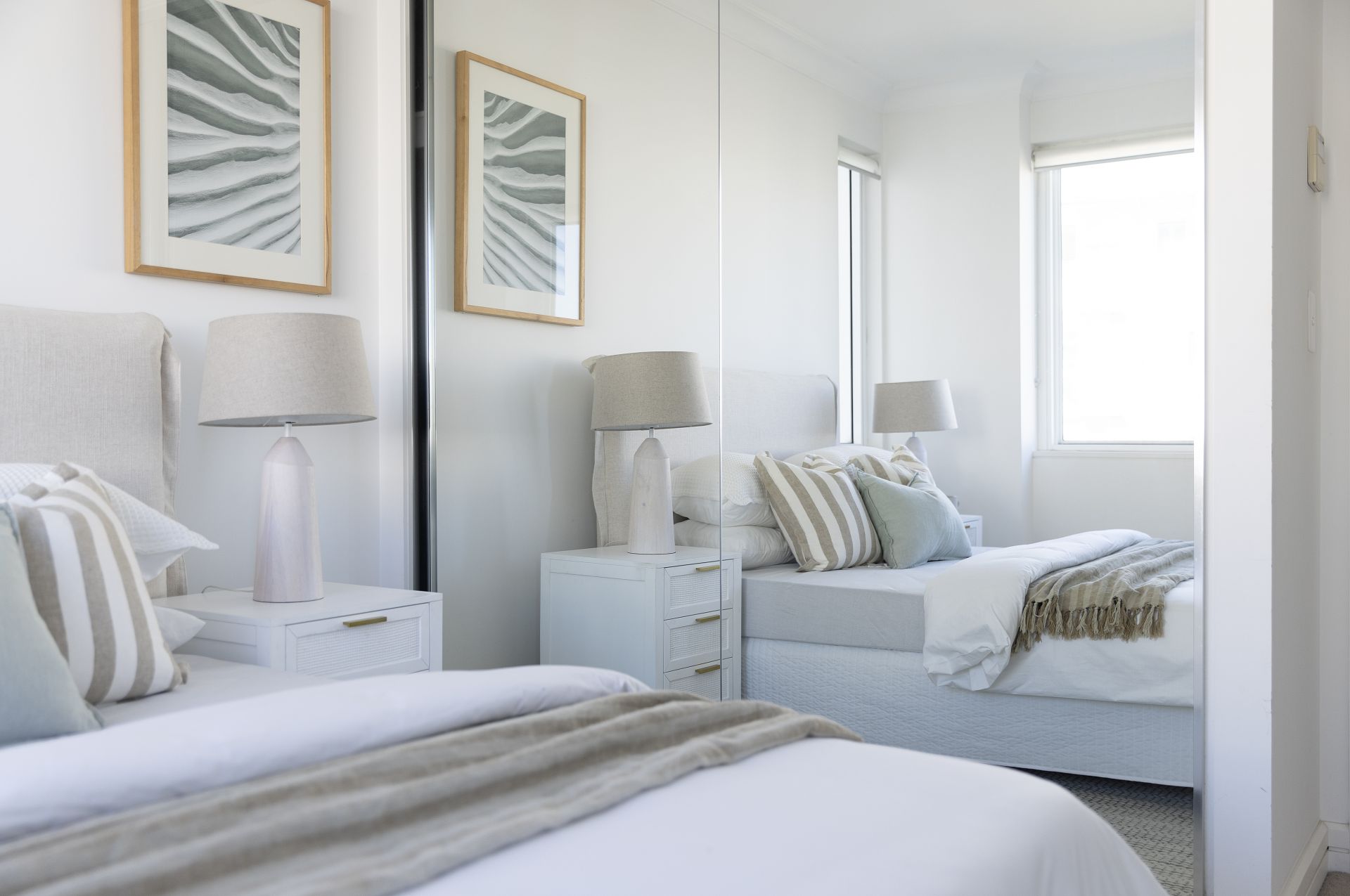 Light filled double bedroom with mirrored built-in wardrobes