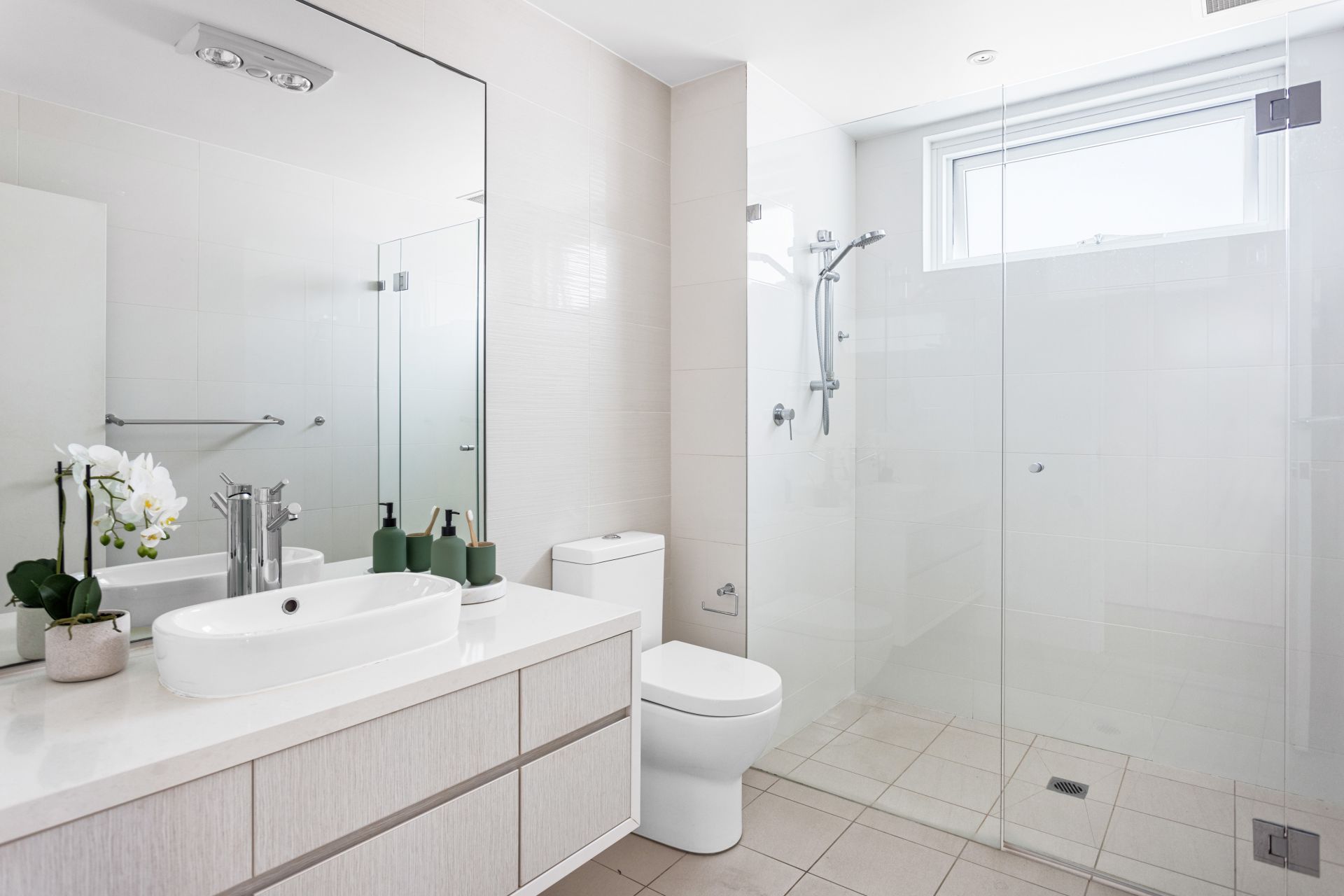 Fully tiled bathroom and separate laundry with dryer