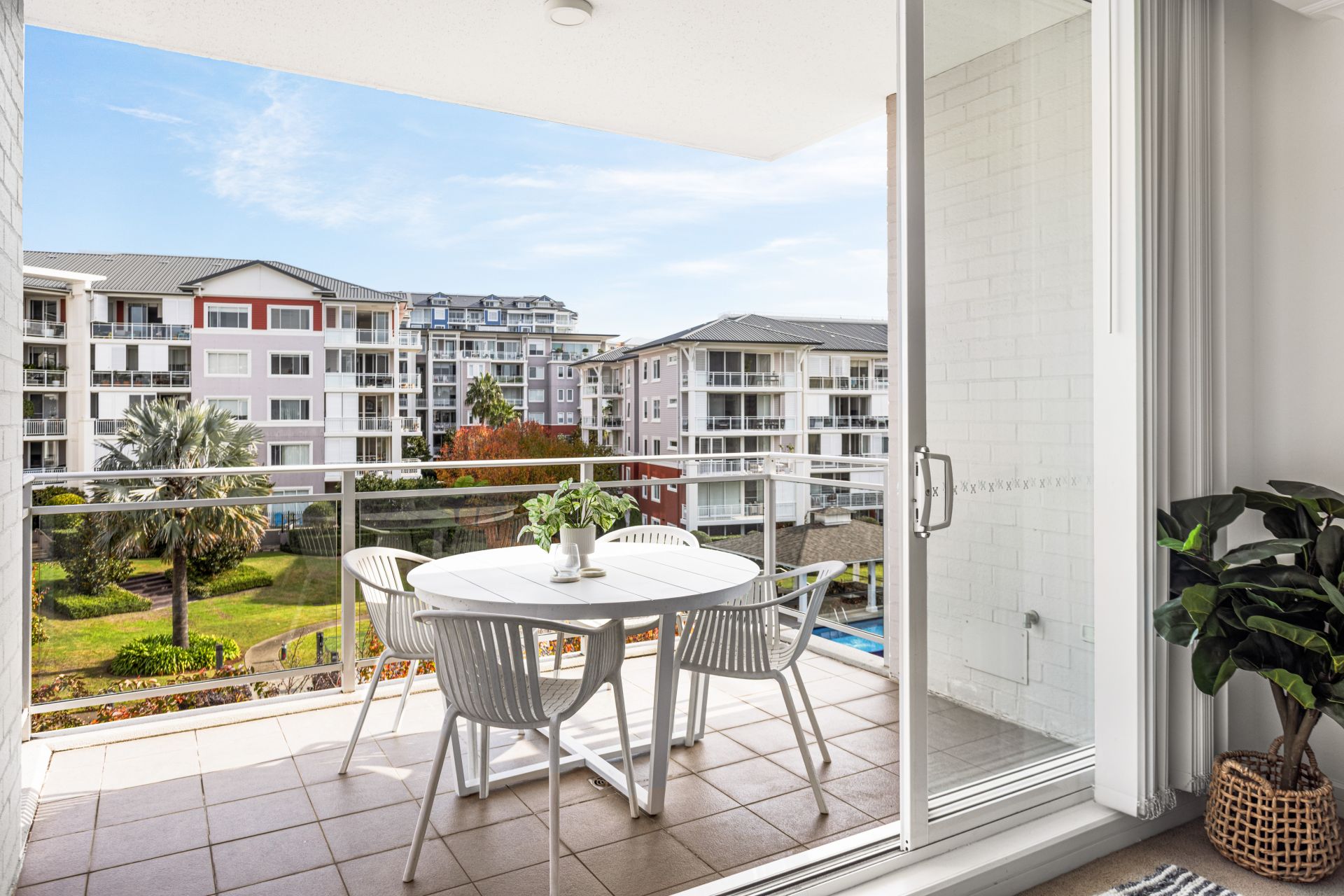 Balcony with peaceful garden and pool views