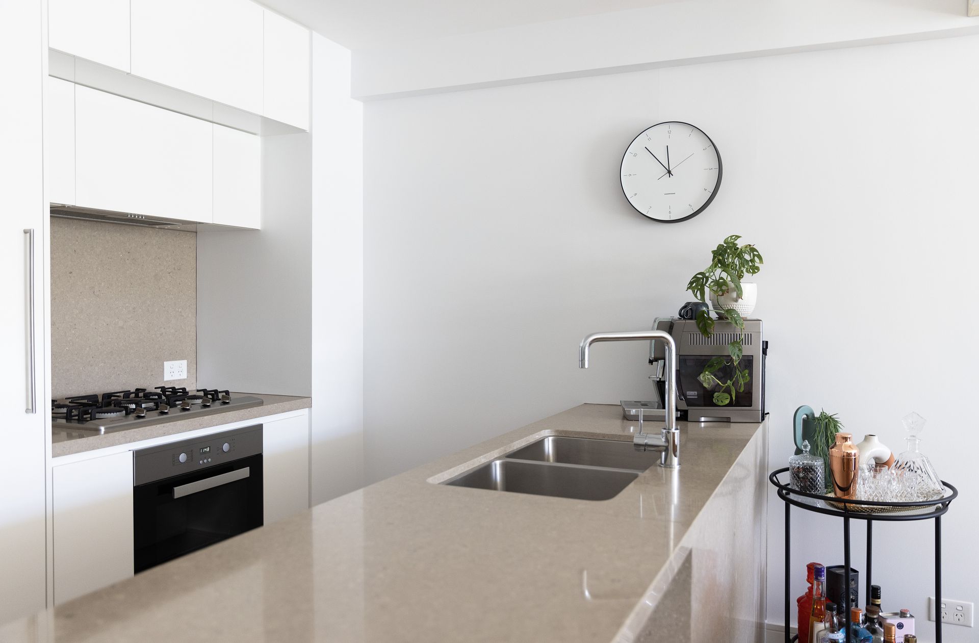 • Modern kitchen with stone benchtops, gas cooking, double sink and ample prep space
