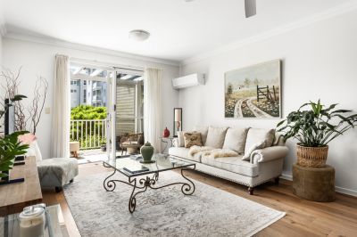 Perfectly positioned in the acclaimed Appleton building, this beautifully presented two-bedroom, two-bathroom apartment offers refined interiors, premium finishes and a peaceful outlook over Breakfast Point's private orchard gardens. Showcasing warm timber flooring and a desirable north-east orientation, the dual-aspect layout ensures abundant natural light across the open plan living and dining area, which flows seamlessly onto a covered balcony - ideal for relaxed entertaining or quiet mornings. The gourmet kitchen features gas cooking, stone benchtops, generous prep space and integrated appliances. Two spacious bedrooms include built-in robes, with the master enjoying both an ensuite and a lovely garden-facing aspect. The second bedroom opens to its own private balcony, adding to the sense of privacy and space.